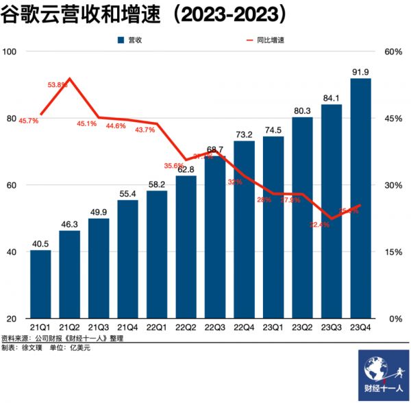 谷歌的云业务原本是谷歌的第二曲线,也是谷歌最寄予厚望的增长引擎。然而,这个引擎正在变得逐渐乏力。近三年来,谷歌云的营收增速逐渐从超过50%,跌至20%~30%的区间。