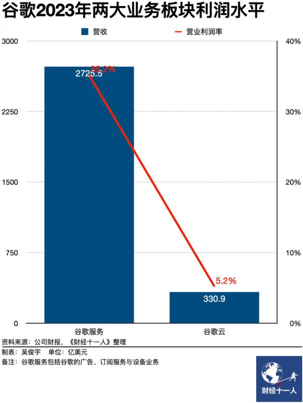 谷歌发展AI另一个深层次的矛盾是,云和广告两大业务部门天然存在利益冲突。2023年财报显示,财务数据来看,谷歌服务(广告+订阅服务和设备)的营业利润率为35.2%,云业务的营业利润率只有5.2%。