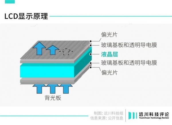 LCD是一种背光显示技术,即依靠底部的背光层发光,通过液晶层来调节光线,与滤光片配合,呈现、变化不同的颜色。我们可以把背光层想象成一个手电筒,对着一扇百叶窗照射;通过调整百叶窗,来实现不同的光线效果。
