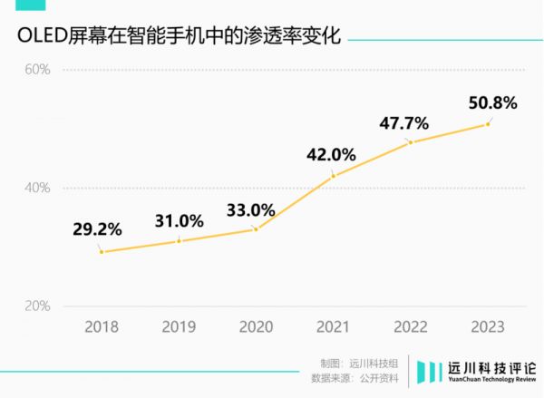 从2018年开始,越来越多的手机厂商也开始意识到OLED的重要性。例如在当时,华为手机的OLED屏幕采用率仅有10%,如今已跃升至60%左右。隔壁的小米,也在过去5年时间,将采用率从个位数百分比提升至接近50%。