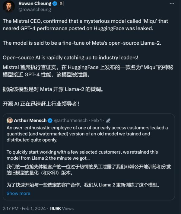 这个战场以 Meta 开源的 Llama 系列模型为基础,成员异常活跃。在其基础上微调的 AI 大模型很多都宣称已经超过 GPT-3.5,甚至已经逼近 GPT-4(比如最近从 Mistral 公司泄露出的“Miqu”模型,该模型接近 GPT-4 性能,是 Mistral 基于 Llama 2 为自家客户训练的早期版本)。