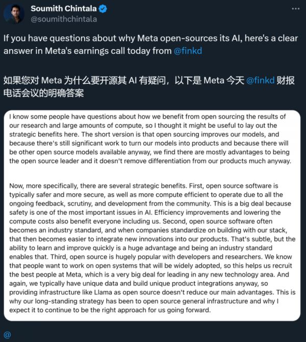 最后,开源在开发者和研究人员中非常受欢迎,这有助于 Meta 招募到最好的人才。