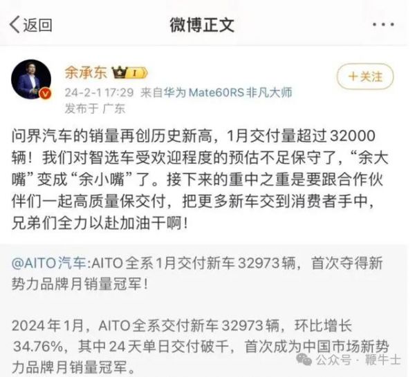 华为常务董事、终端业务CEO、智能汽车解决方案BU董事长转发了这个消息,称对智选车受欢迎程度的预估不足保守了,调侃自己从「余大嘴」变成了「余小嘴」。