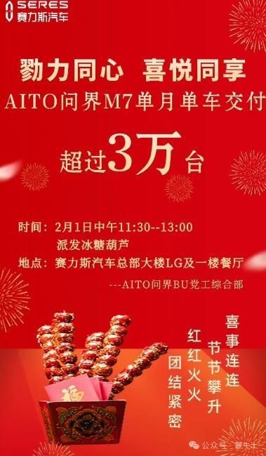 问界背后的车厂赛力斯,也内部发布庆祝海报,为员工派发冰糖葫芦,「勠力同行,喜悦同享」。