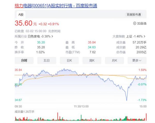 而更让人惊叹的是,格力的股票竟然因此涨了1.4元每股。活动结束后,1月29日,格力电器股价迎来了一波上涨。当天,格力电器的股价涨超4.16%,达到了35.06元/股的历史新高。而2月2日,五连涨之后,格力电器股价站到收盘价上35.60元。与此同时,公司的市值也飙升至1974亿元,重新逼近2000亿元大关。