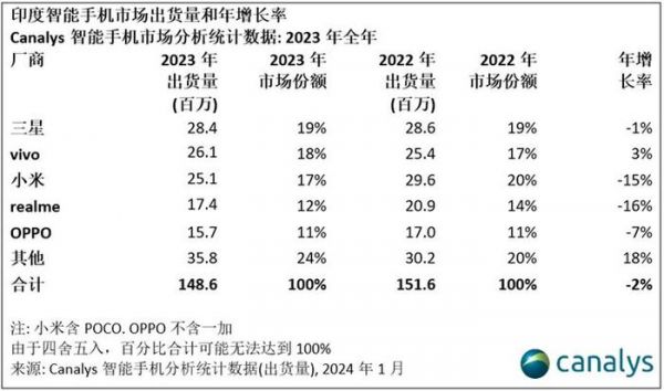 除了笔记本业务以外,小米在印度主营且大卖的手机业务也受到了极大的影响,来自Canalys的调研报告,2023年小米在印度的智能手机市场份额从2022年的第一名跌落至第三名,销量大跌15%。
