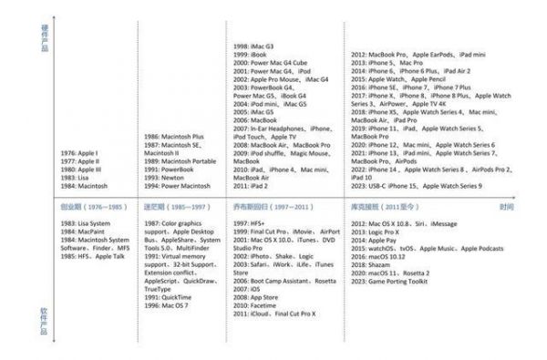 苹果自1976年创业,至今近50载。它的发展历史一般划分为四个阶段:创业期(1976—1985)、迷茫期(1985—1997)、乔布斯回归(1997—2011)和库克接班(2011至今)。
