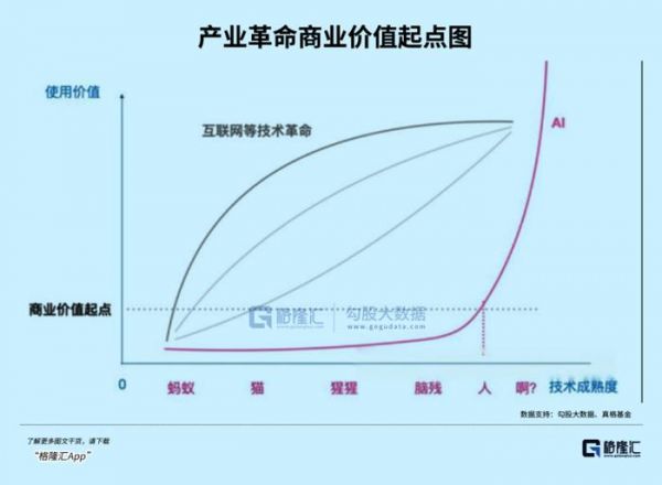 互联网等技术革命和AI商业化起点,很不同。只要技术突破的某一点,互联网商业化起点就开始了,曲线呈现的是先大涨,然后变得平缓,直至产业发展到达饱和期。但AI有可能完全颠覆这个过程,产业化的起点可以很晚,但一旦启动,后面就是指数级别的增长,并且越来越快。