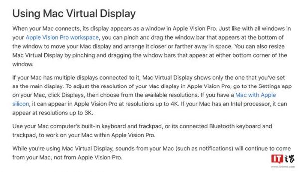 ▲ 图源 苹果官方新闻稿IT之家从支持文件中得知,苹果公司声称所有 Mac 设备需要更新至 macOS 14,才能与 Vision Pro 头显配对使用“虚拟显示器”功能,不过旧款英特尔芯片 Mac 仅支持 3K 分辨率,而 Apple 芯片 Mac 支持 4K 分辨率,官方兼容设备列表如下: