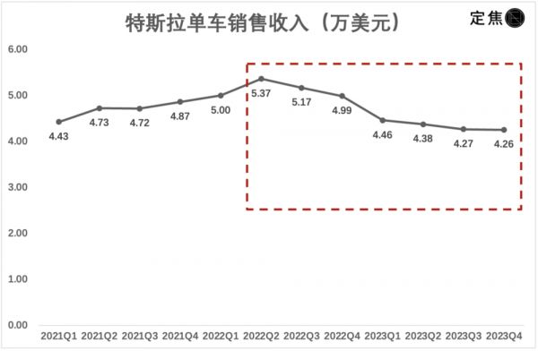 2022年,特斯拉的单车销售收入是5.1万美元,2023年只有4.3万美元,降幅达15%。在2022年二季度达到5.37万美元的高点后,连续降了六个季度,现在不到4.26万美元(约30万元人民币),史上最低。