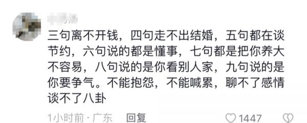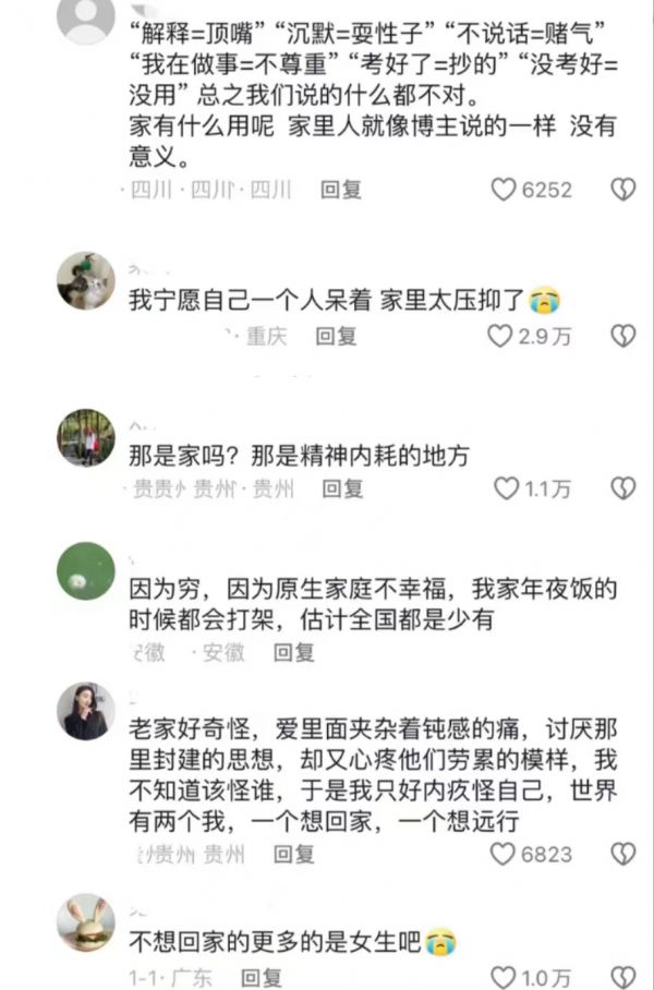 这种春节期间的家庭对话常常充满比较和期望,令年轻人压力重重。而年轻人面临的挑战与父辈不同,代际之间的沟通缺乏理解。这样的结果让这些年轻人选择逃避。不是他们不爱家,而是压力和不被理解让年轻人选择远离。