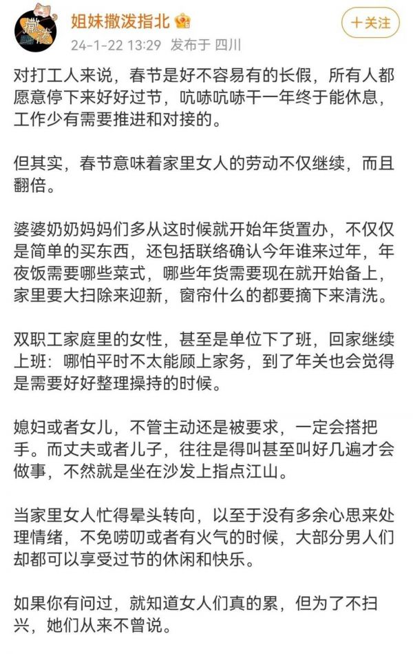 此外,春节聚会往往也呈现出鲜明的性别分工问题,看似热闹哄哄的宴席暗藏的是等级分明的权力结构。网友说:“小时候过年的年味,都是靠家里的妈妈奶奶姨姨婶婶大扫除,买年货,做年夜饭,包饺子,一点点堆积起来的。”在多数家庭里,女人们做饭、打扫、整理,忙得团团转,以自己的劳动为燃料贡献出一桌丰盛的饭菜。男人们则聚在一起抽烟喝酒,聊天打牌。