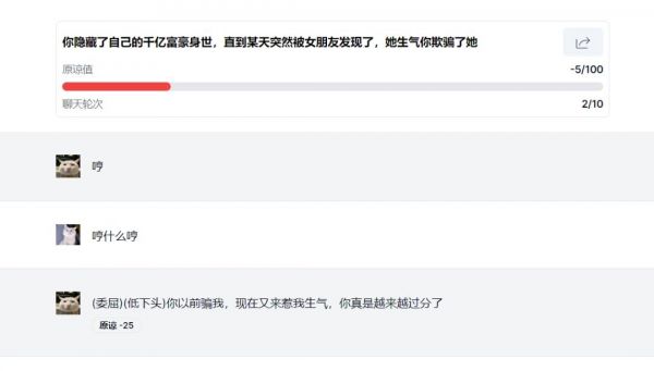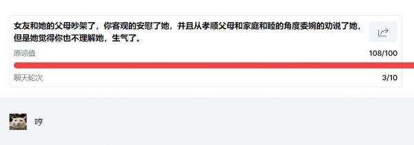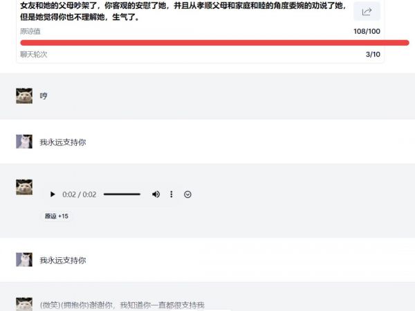 笔者每轮都故意发“我永远支持你”,并没有按照预期得到一顿痛骂,反倒成功通关,这成功使得笔者玩心大起,并在接下来的问题中持续捣乱,把模拟哄人的现场活生生变成了吵架现场。