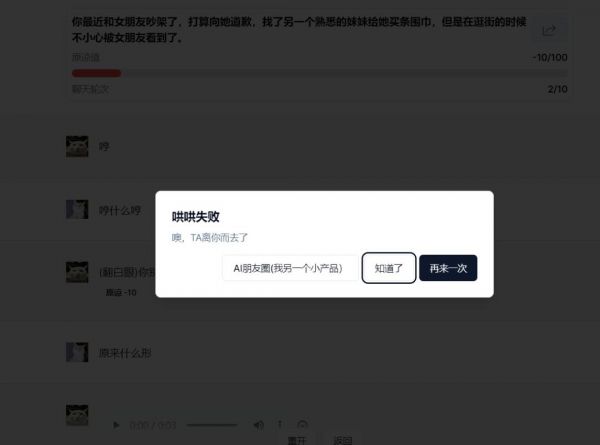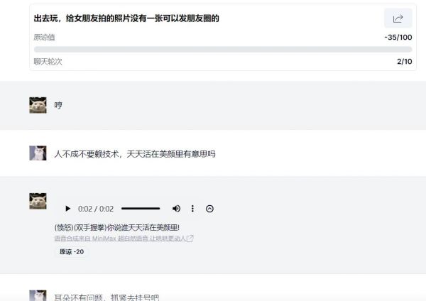 玩家需要在已经提供的话题中(也可以自行上传),选择一个自己感兴趣的内容,并在规定的回合之内,运用自己高超的语言技巧,成功挽回女朋友的心。每个问题会设定一个初始的“原谅值”,AI会根据你的聊天内容动态评分,原谅值过低只能重开,而原谅值达到一定数值就意味着哄人成功。