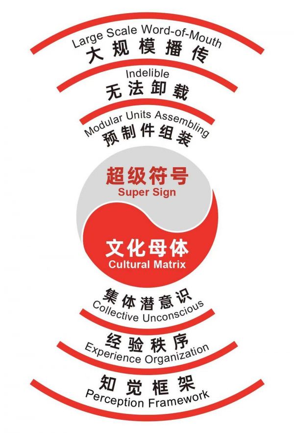 从文化母体里如何提炼出超级符号?我们所有的设计都是用标准化的预制件来拼装。预制件很容易安装到人的脑海里,置入之后无法卸载。无法卸载之后,还要实现大规模的播传,这时的播传就不用再花钱了。