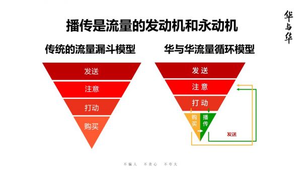 传统流量漏斗模型是单向传播,从发送、注意、打动到购买。但我们的播传模型是流量循环,不管买还是不买都要替品牌做传播。