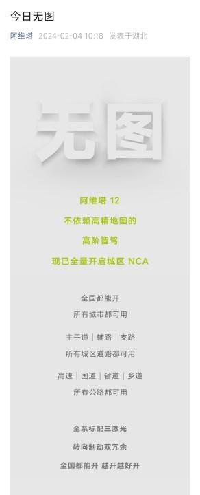 IT之家 2 月 4 日消息,阿维塔官方发布消息,阿维塔 12 高阶智驾现已全量开启城区无图 NCA,不依赖高精地图,官方号称全国都能开,所有城市都可用。主干道、辅路、支路所有城区道路都可用,高速、国道、省道、乡道所有公路都可用。