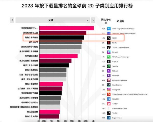 2、 2024 年 1 月 15 日,市场分析机构 data.ai 最新发布《2024 移动市场报告》显示,SHEIN 登顶全球购物类 APP 下载榜,Temu、Amazon、速卖通 Aliexpress 分别位于 2023 购物类 APP 下载量第二位、第三位和第九位。