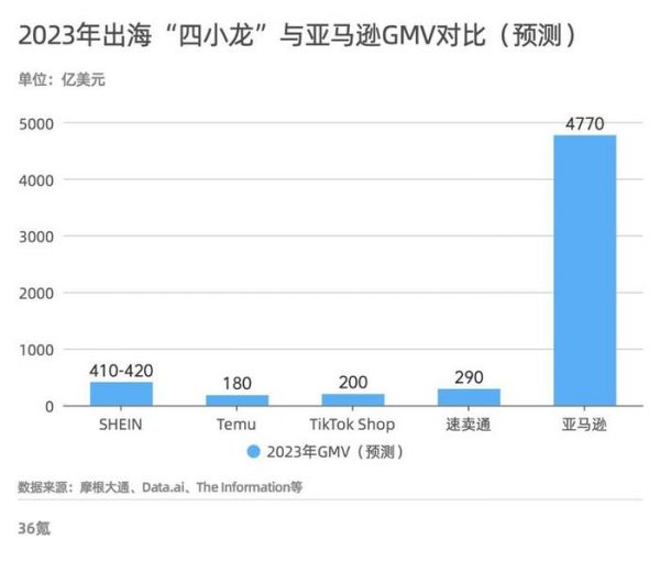 36 氪此前曾报道,2023 年 SHEIN、Temu、Tik Tok Shop 预计 GMV 分别为 410-420 亿美元、180 亿美元、200 亿美元;而亚马逊平台 2022 年总 GMV 为 6982 亿美元,据摩根大通团队预计,其 2023 年 GMV 约为 4770 亿美元,保持断层式领先。