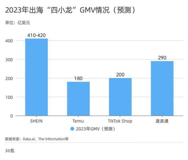 "四小龙"2023年GMV情况,36氪制图整体来看,依托平台自带的原始流量,TikTok Shop 的日子过得相当不错,后续将在北美地区继续保有原生优势;而 SHEIN、Temu 和速卖通的耀眼 " 战绩 ",靠的是全托管服务模式的兴起。