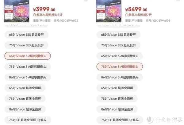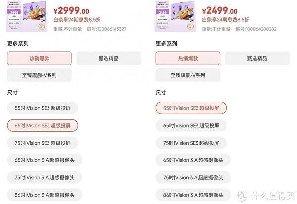 45寸、35寸等,差价也都在500元左右。换句话说,尺寸大了10寸,价格只高了500元。但是65寸以上的电视机,差价可就多了,我们同样去购物页面看一下▽