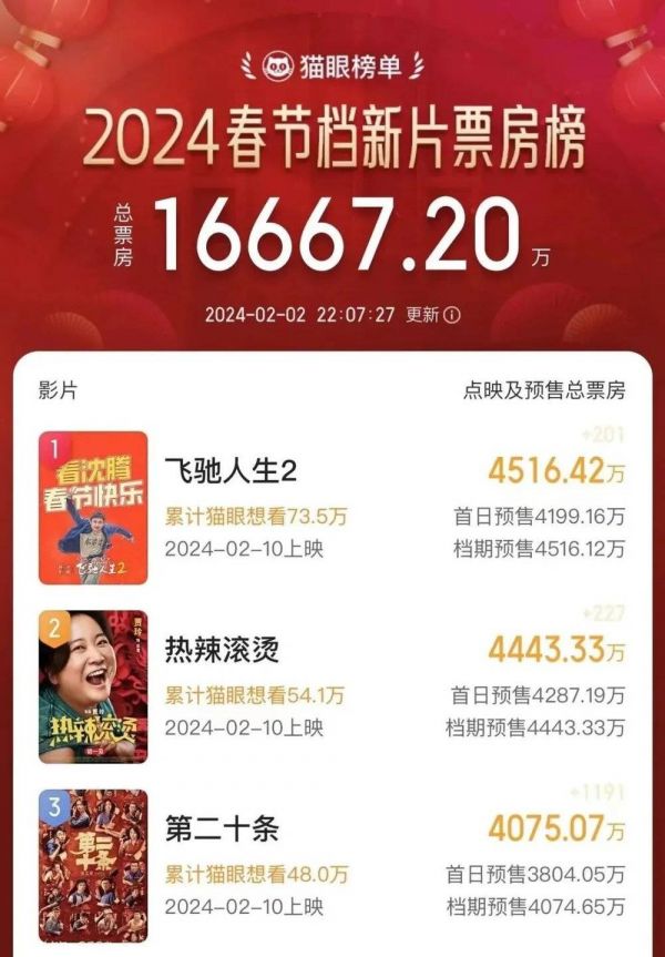 比去年提前两天开启的春节档预售,今天来到第三天,截至毒眸发稿前,春节档总预售票房已经超过1.66亿。