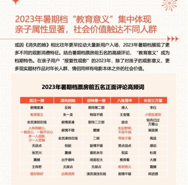 据灯塔报告显示,在全年票房占比高达38%的暑期档中,五强影片的高频词是“教育意义”“剧情不错”。而同档期的工业大片《巨齿鲨2:深渊》《变形金刚:超能勇士崛起》等电影反而竞争力有限。
