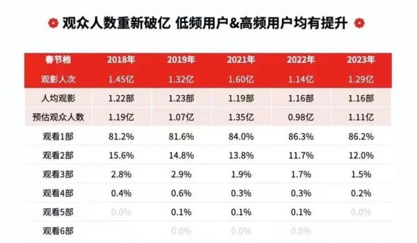 观影频次是恢复春节档观影人次的重要维度。据猫眼《2023春节档数据洞察》,2023年春节档观看2部及以上电影的观众占比近14%,基本与2022年持平,但远不及2018年的近19%。