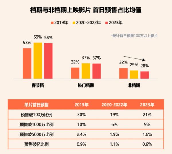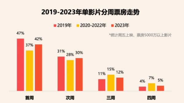 从另一个视角来看,去年的市场经验显示,如今的观众购票决策已经显著后移,倾向于在影片热度或口碑起来之后再购票,因此在预售阶段卖出好成绩越来越困难。据灯塔报告,2023年首日预售占比均值比前几年更低,尤其是在非热门档期,甚至影片首周票房占比都在下滑,而次周占比有所提升。