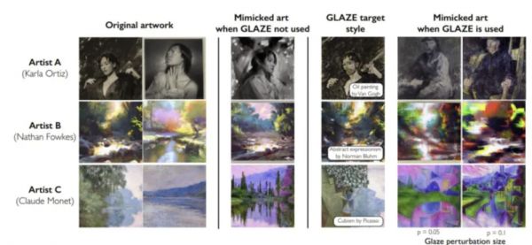 事实上,在开发Nightshade之前,芝加哥大学的这个团队还推出过另外一款保护艺术家的免费应用程序:Glaze。和Nightshade类似,Glaze也是给图片施加一些微小的改变,让AI难以辨认一幅作品的风格。