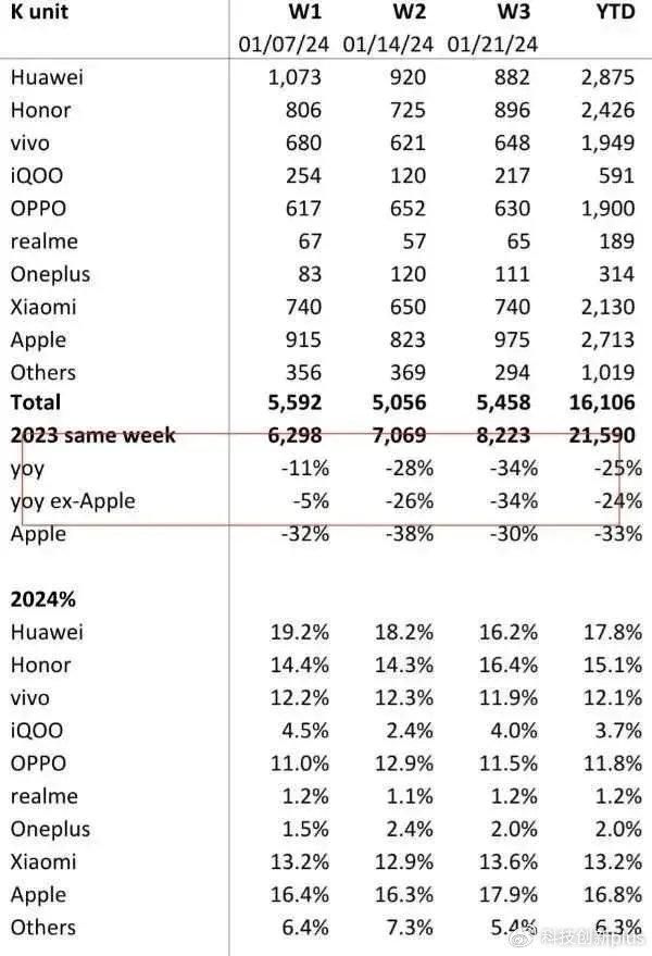 而2024年一开始,一些机构就按周发布了大家的销量数据,引发了各个品牌之间的粉丝又开始一片混战,那么问题来了,开年各大手机销量到底怎么样?