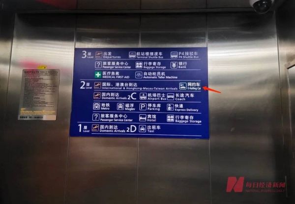 2月4日,《每日经济新闻》记者前往浦东机场T2航站楼实地探访发现,在国际、港澳台地区到达2层出口的直梯处,网约车的相关标识被补贴在指示牌上,还有指示牌提示:网约车上车点请前往P2停车库。