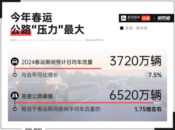 2024春运期间预计日均车流量将达到3720万辆,比去年同期增长7.5%;高速公路峰值将达到6520万辆,这是春运期间路网平均车流量的1.75倍左右。