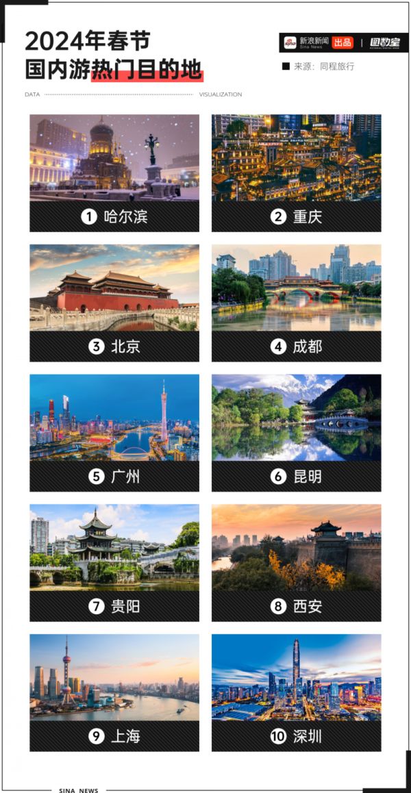 今年春节,哈尔滨不负众望,成为最热门的国内旅游目的地,并带动东北相关目的地客流大幅增长。位于国内游第二位的热门目的地是重庆,第三为北京。