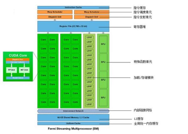 流式多处理器架构细节以Fermi架构下单个流式多处理器为例,里面包含了多种部件,最显眼的是32个Core(又叫做CUDA Core,如上图左边部分所示),也就是“流处理器”运算核心。Fermi架构的单个图形处理簇能高效完成一些指定的任务,成为一个引擎,如PolyMorph Engine多边形变形引擎,可以大幅度提升几何图形的处理能力。