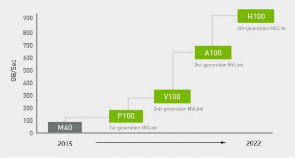 过去,数据主要通过PCIE数据通道在主机与GPU之间通信,如PCIE 3.0 x16的带宽是16GB/S。使用GPU进行计算之后,显卡之间也要传输数据,英伟达开发了专门的NVLink传输通道连接显卡,带宽不断提升,H100的4代NVLink已经是900GB/S,是基于PCIE传输带宽的10倍以上。