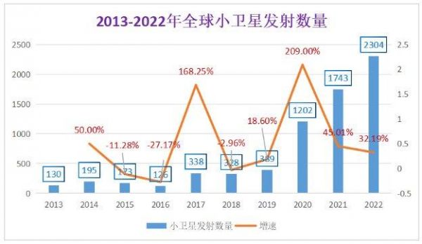 从发射数量上看,2022年全球共发射卫星2413个,其中小卫星2304颗,数量占比95%,小卫星中通信卫星数量占比80%,比其他类卫星之和还多。