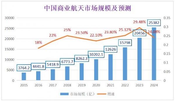 近年来,在国家政策和资本力量多方加持下,我国商业航天产业保持高速发展,从上图中可以看到,2015-2022年商业航空保持着23%的年均复合增长率,2020年市场规模已经突破10000亿元,2024年将突破25000亿,预计未来3年,产业将继续以高于20%的增长率进行扩张。