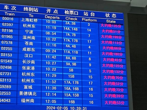 “一开始告诉我只是晚点几十分钟,我还一遍又一遍地刷新12306软件里的晚点信息,这个软件就像狼来了的故事一样,把发车时间一点一点往后挤,就是不能给个真实信息。”下午3点,临近屏幕上显示的预计发车时间,余江淮甚至只是呆在2楼的餐饮区不愿意下去。