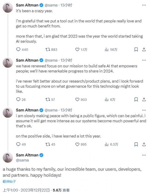 2023年12月,Open AI董事长萨姆·奥特曼在X(原推特)上发表了自己的“年终总结”。