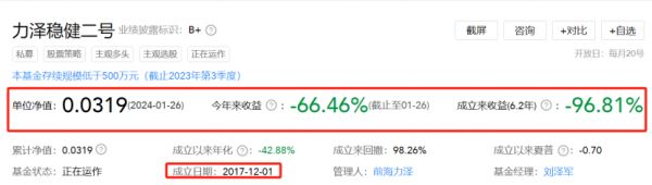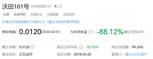 截至2月1日,一只名为“沃田101号”的私募基金单位净值仅剩0.012元。2024年开年至今,该产品收益更是猛跌88.12%。