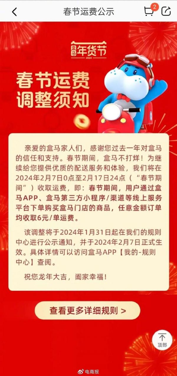 比如盒马发布公告称,2月7日-2月17日,用户通过盒马App、盒马第三方小程序/渠道等线上服务平台下单购买盒马门店的商品,任意金额订单均收取6元/单运费。