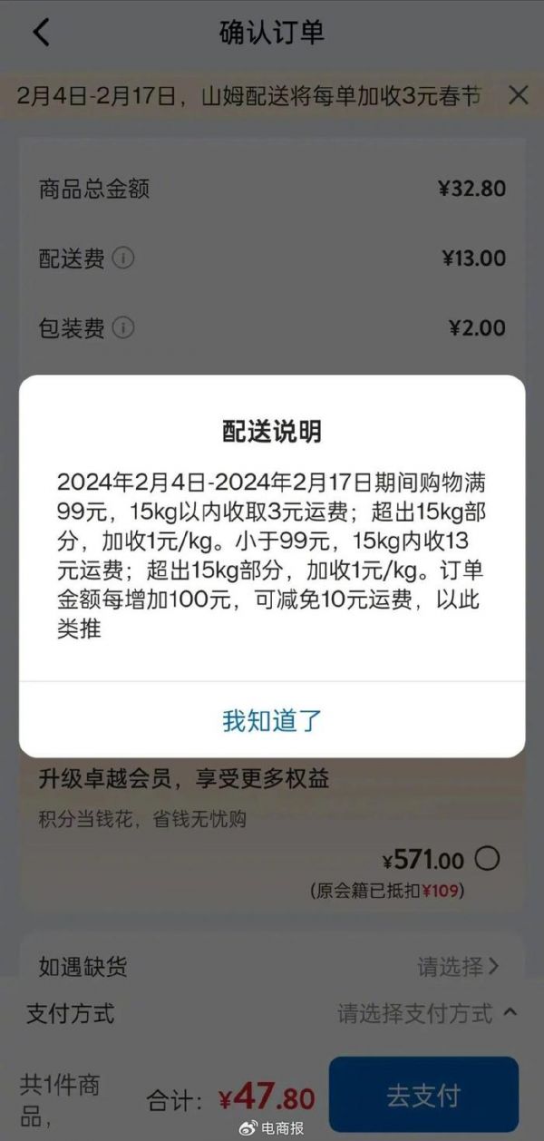 另一边的山姆也宣布,2月4日-2月17日,每笔订单都会加收3元运费。比如在以往,购物满99元、重量15kg以内可以免运费,但春节期间山姆配送照样要收取3元的运费。