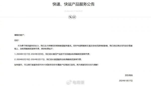 京东物流表示,1月17日-2月9日,将对重货产品按不同线路加收高峰期资源调节费;2月10日-2月17日,将对寄递服务加收高峰期资源调节费;