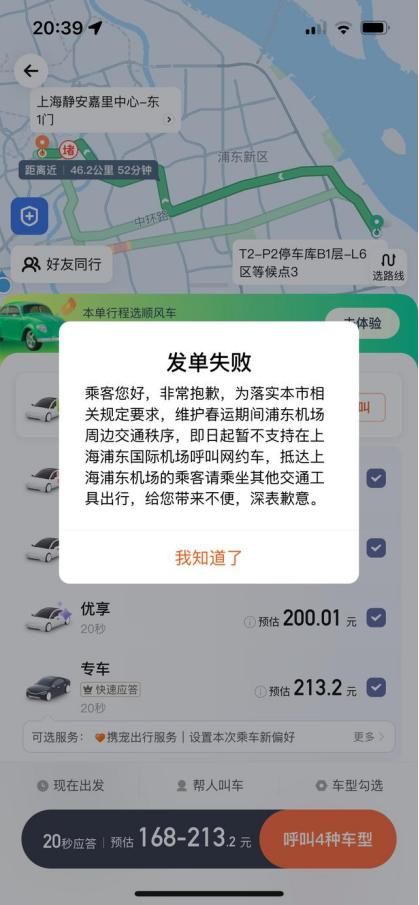 浦东机场内外,不管是美团、滴滴、高德还是大众出行的网约车,全部都铩羽而归,唯有一家名不见经传的“空港出行”,仍可正常提供线上下单、预约司机等服务。