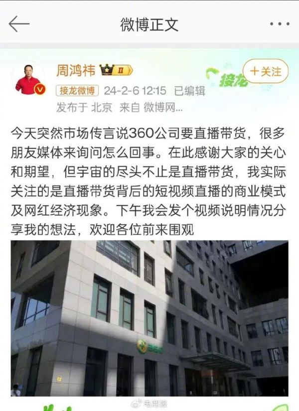在消息传出后,周鸿祎本人也发微博进行了回应。他声称,宇宙的尽头不止是直播带货,自己实际关注的是“直播带货背后的短视频直播的商业模式及网红经济现象”。