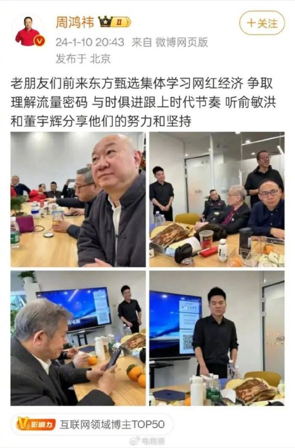 1月10日,周鸿祎还带着一众企业家到东方甄选集体学习“网红经济”。用他的话来说,是“争取理解流量密码,与时俱进跟上时代节奏,听俞敏洪和董宇辉分享他们的努力和坚持”。