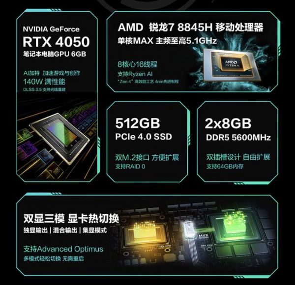 “R7-8845H + RTX4050”款采用 8 核心 16 线程锐龙 7-8845 H 移动处理器,单核 MAX 主频至高 5.1GHz;