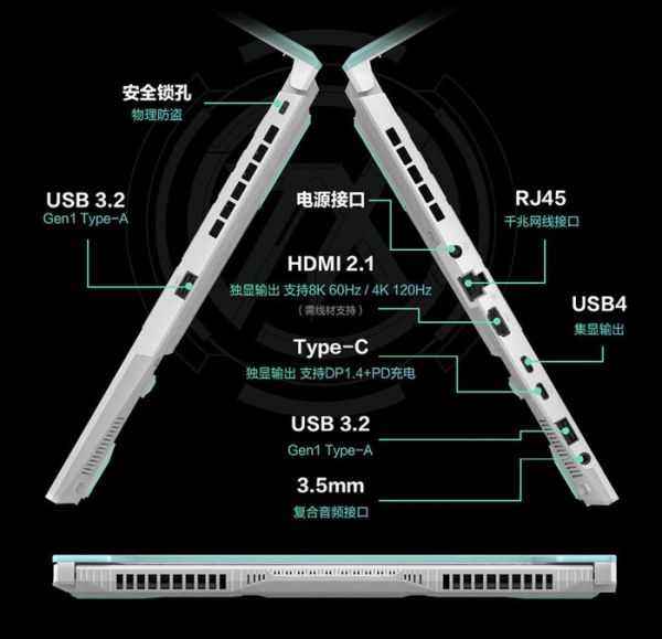 接口方面,该笔记本搭载 1 个 USB-C 4.0 接口、1 个“全功能”USB-C 接口、2 个 USB-A 3.2 Gen 1 接口、1 个 3.5mm 音频接口、1 个 HDMI 2.1 接口。