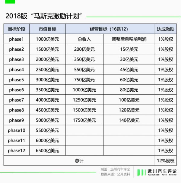 “激励计划1.0”结束后的2018年,难度更高、奖励更丰厚的2.0版本也同步开启,考核指标变成了市值和收入/利润,规则与2012年那一版相同,只不过变成了12个阶段。如果能全部完成,给予马斯克的激励将会是12%的股票期权。